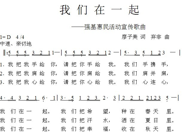 2011年11月以来,他们针对当地群众喜好歌舞的特点,创作了一首名叫我《我们在一起》的歌曲,并教群众学唱,以群众喜闻乐见的新方式大力宣传自治区党委在全区开展创先争优强基础惠民生活动,深受群众欢迎,取得了很好的效果。