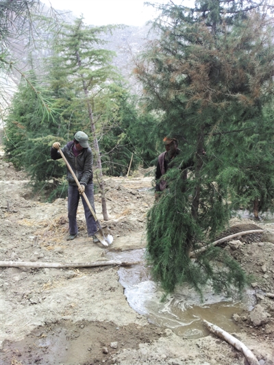 “今年3月5日开始,施工人员就开始进入施工工地,挖树坑、划标线,为栽种树苗做前期准备。3月23日大批施工人员就进入工地,开始栽种树苗。”拉萨军达绿化工程有限公司施工现场负责人凌同辉介绍,他从事绿化工作已经7年了。去年,他们公司负责的拉萨至贡嘎机场专用公路区域造林绿化二期工程还剩下600亩的绿化任务了。目前,施工工地已有六台挖掘机在现场施工,开始挖掘树坑,过两天还要再调过来两台挖掘机一起施工。
